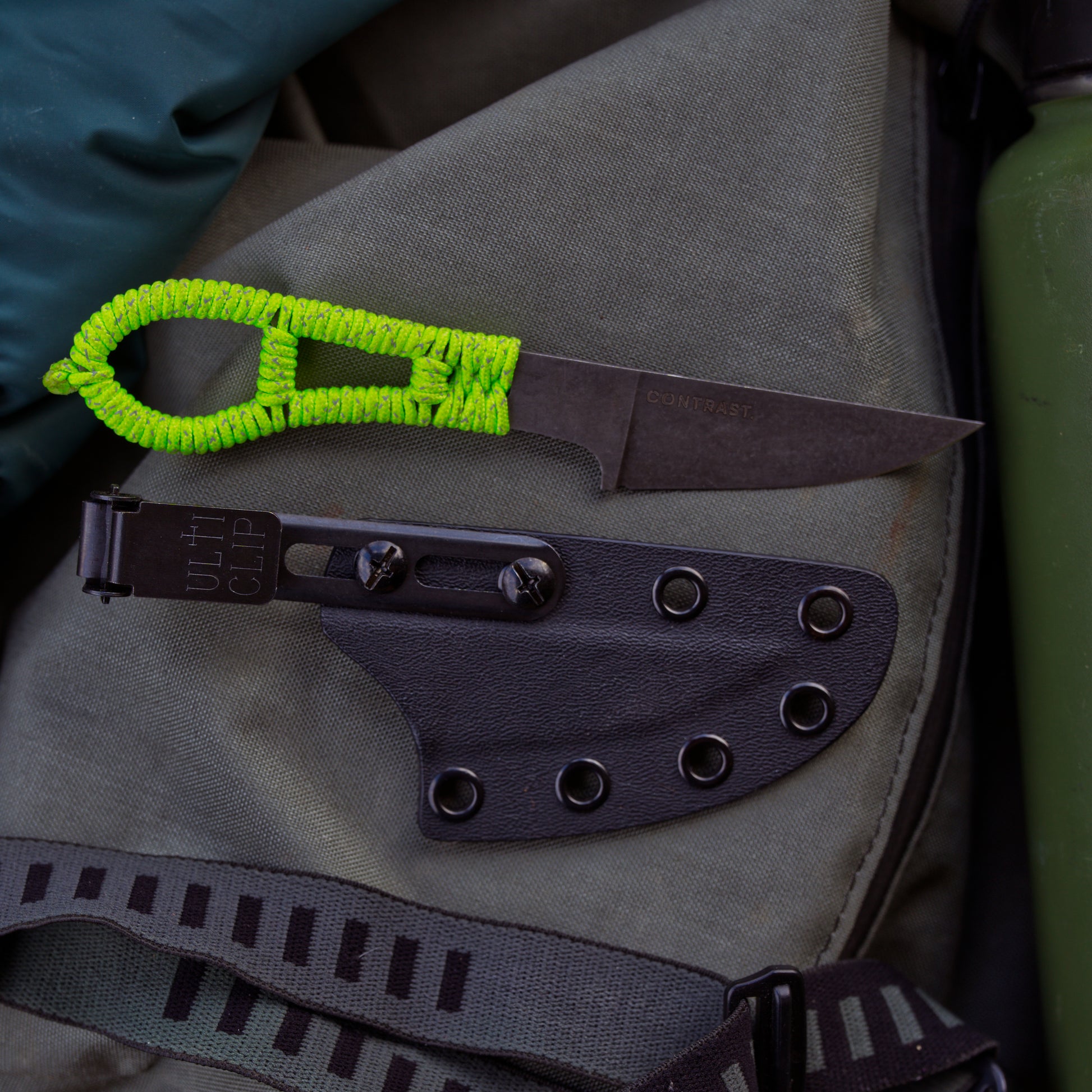 The kydex sheath is designed to be sleek and easily tuck into a pocket or a pouch on a bino harness. It won't shake loose after the included Ulti Clip is clamped down.